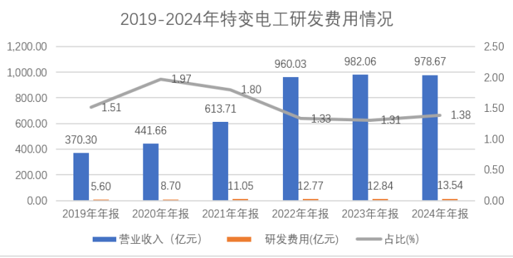 下图显示了过去6年来特变电工的研发费用和占比情况,可以看出到2022年到2024年的研发费用整体增长几乎非常缓慢,而且研发占比一直没有突破2%。